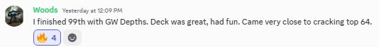 Discord user Woods who piloted Green-White Depths to a top 100 finish shared their thoughts in the GreenSunsZenith Discord.